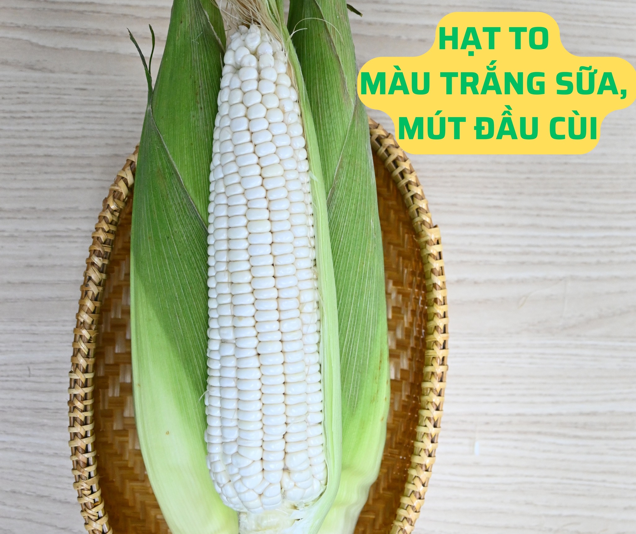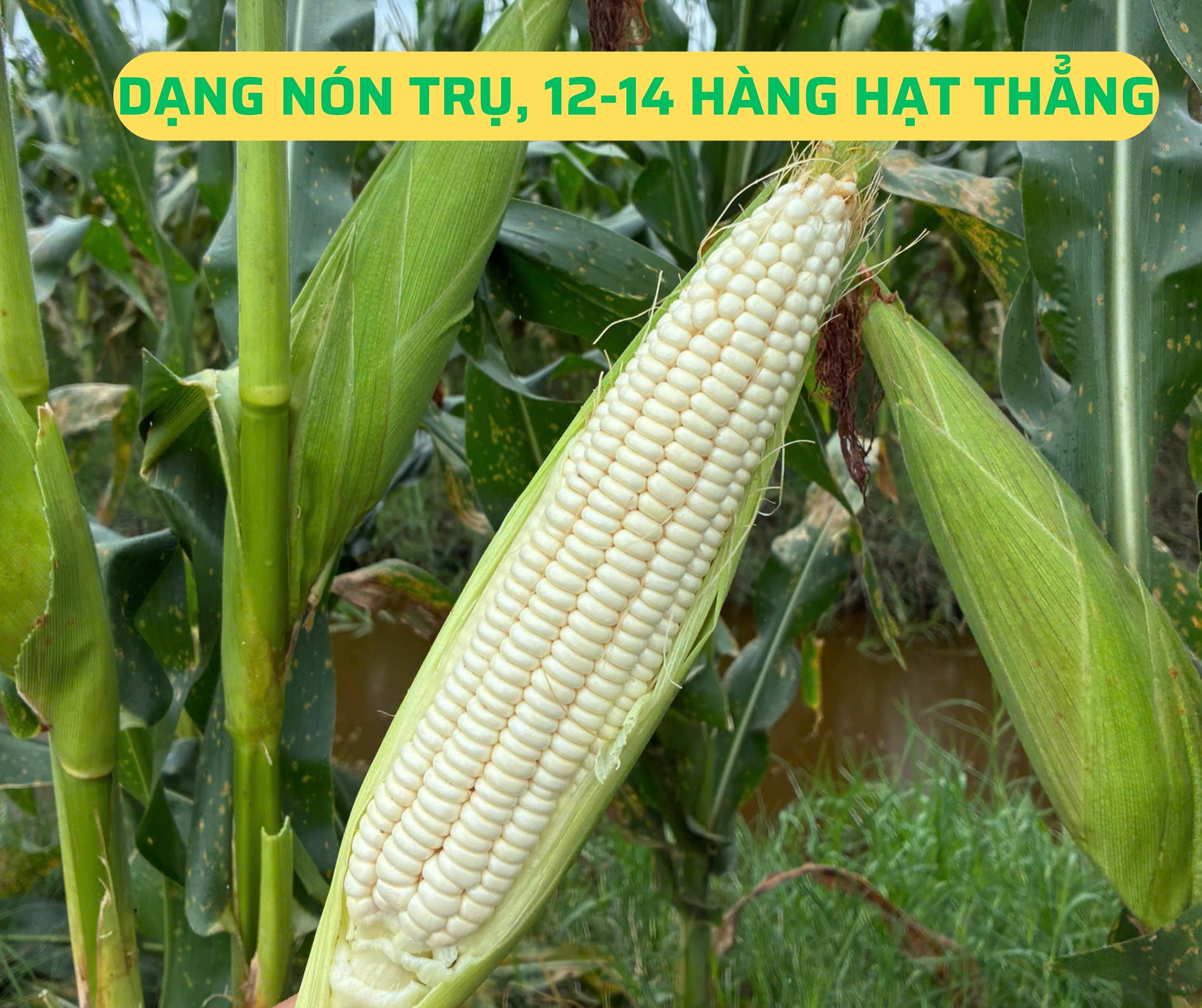 Dạng hình bắp: vỏ bi màu xanh đậm, bao kín bắp. Bắp dạng nón trụ, có 12-14 hàng hạt, hàng hạt thẳng, kích thước hạt to, màu trắng.