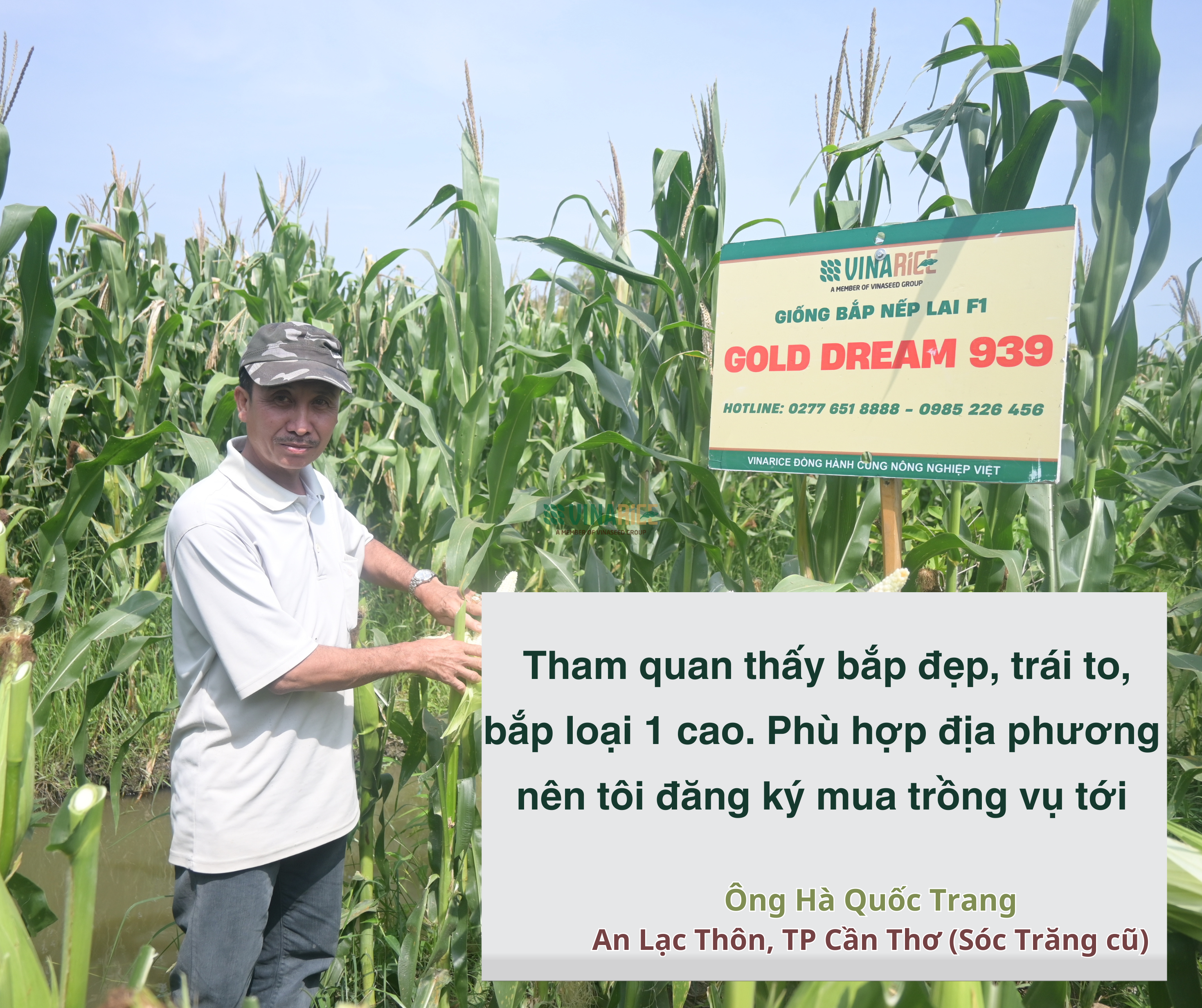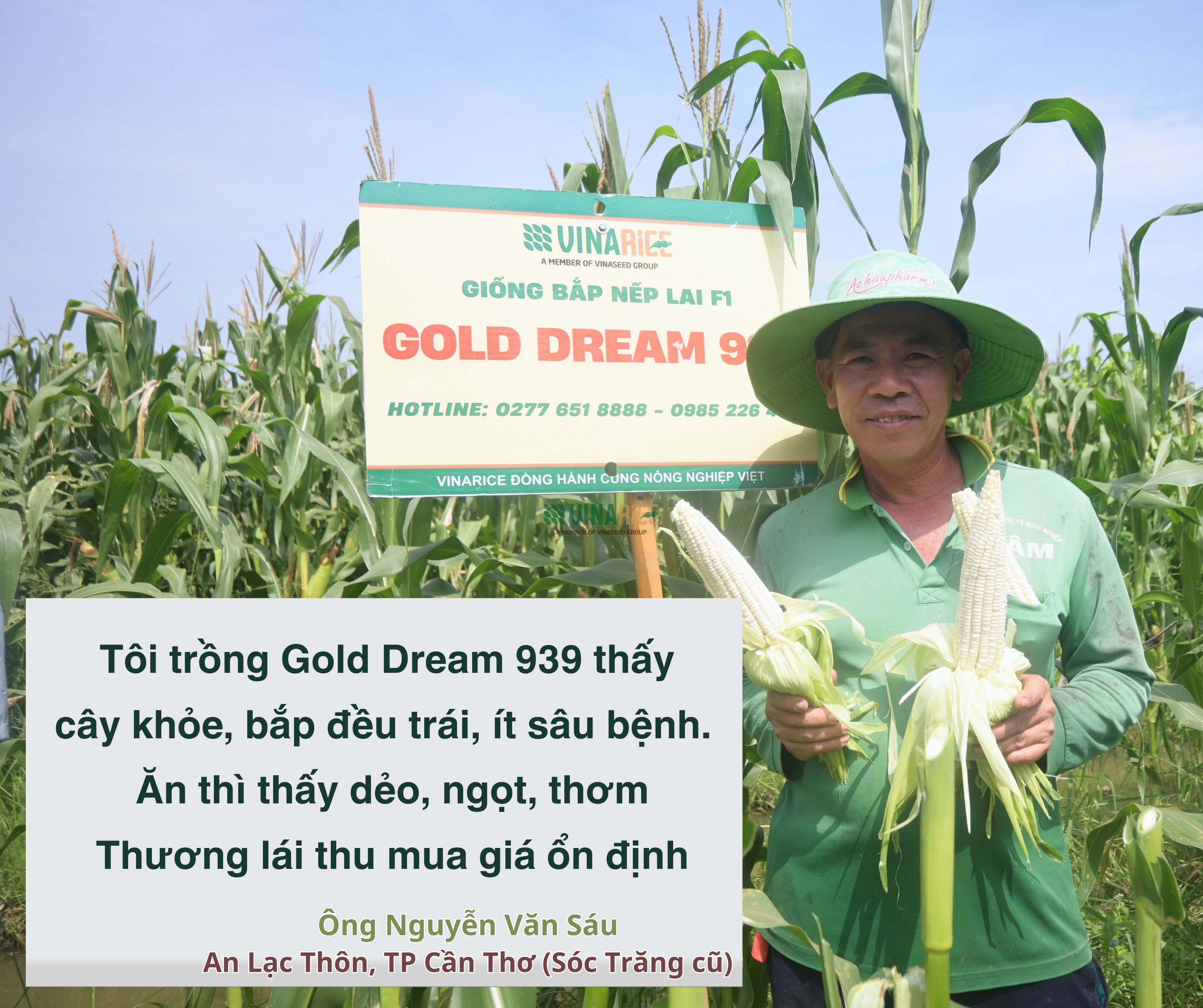 “Tôi trồng Gold Dream 939 thấy cây khỏe, bắp đều, ít sâu bệnh. Thời tiết nắng mưa thất thường mà bắp vẫn phát triển tốt. Ăn thử thì thấy dẻo, ngọt, thơm nên rất yên tâm.”