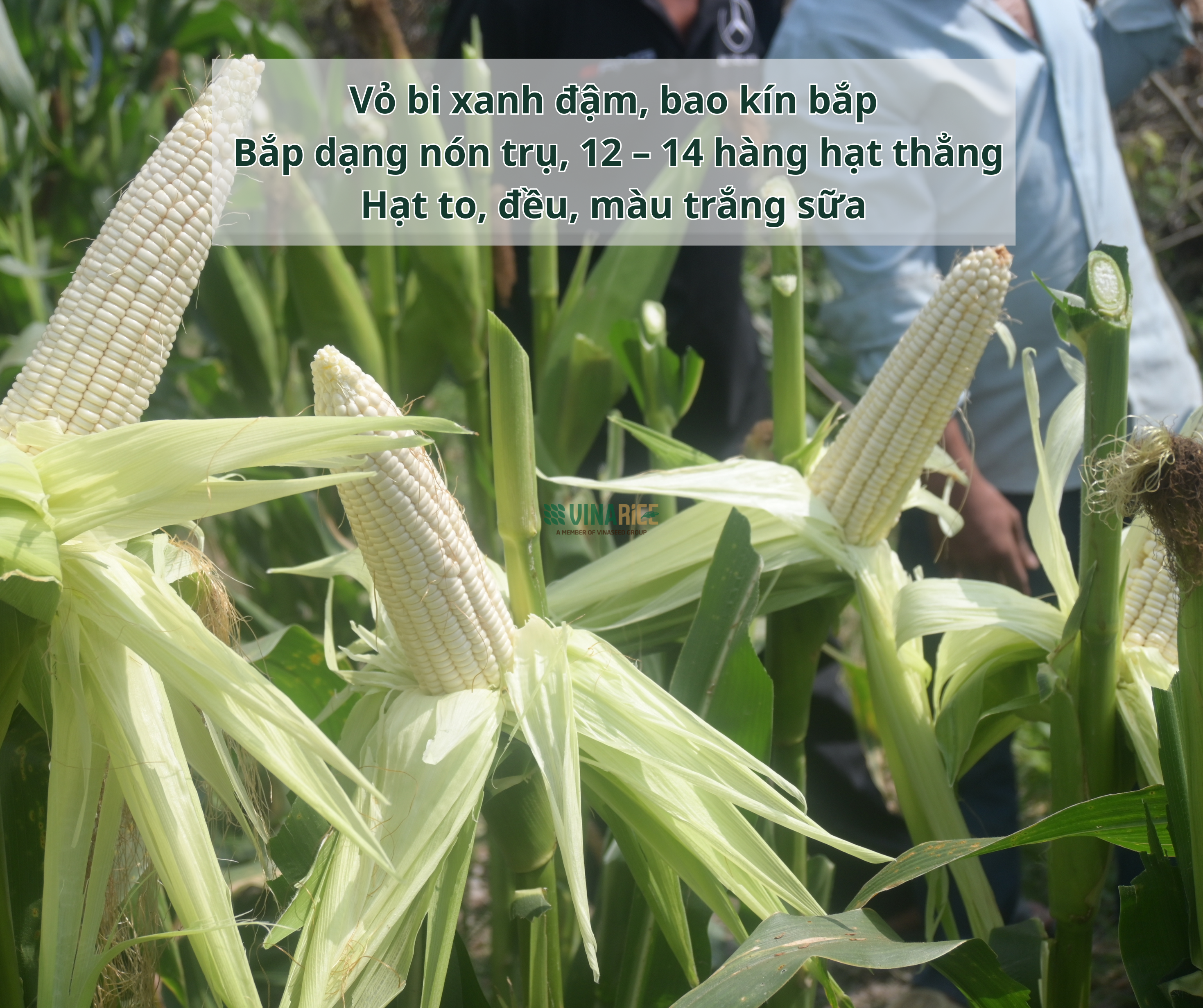 Dạng bắp: Vỏ bi xanh đậm, bao kín bắp; bắp dạng nón trụ, 12 – 14 hàng hạt; hạt to, đều, màu trắng